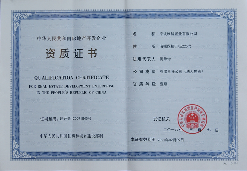 2018年3月7日,國家住房和城鄉(xiāng)建設(shè)部通過了寧波維科置業(yè)有限公司房地產(chǎn)開發(fā)一級(jí)資質(zhì)延續(xù)審核,頒發(fā)了編號(hào)為建開企【2009】845號(hào)的中華人民共和國房地產(chǎn)開發(fā)企業(yè)資質(zhì)證書。維科置業(yè)房地產(chǎn)開發(fā)一級(jí)資質(zhì)再次獲得順利延續(xù)。