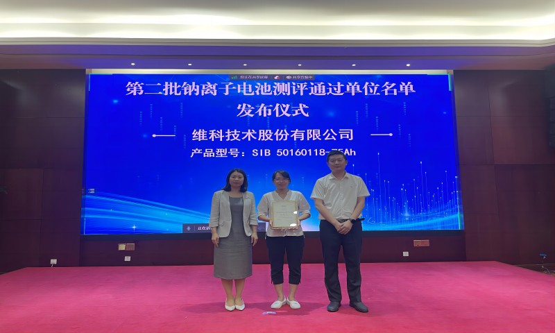 2023年9月11日,工信部綠色電池重點實驗室成立大會暨學(xué)術(shù)委員會年度工作會在北京成功召開,同時頒發(fā)了全國第二批鈉離子電池測評通過單位證書。在此次測評中,共有8家企業(yè)成功通過了測評,其中維科技術(shù)股份有限公司的SIB 50160118-75Ah鈉電池以卓越的技術(shù)研發(fā)和出色的產(chǎn)品性能通過了鈉離子電池測評。