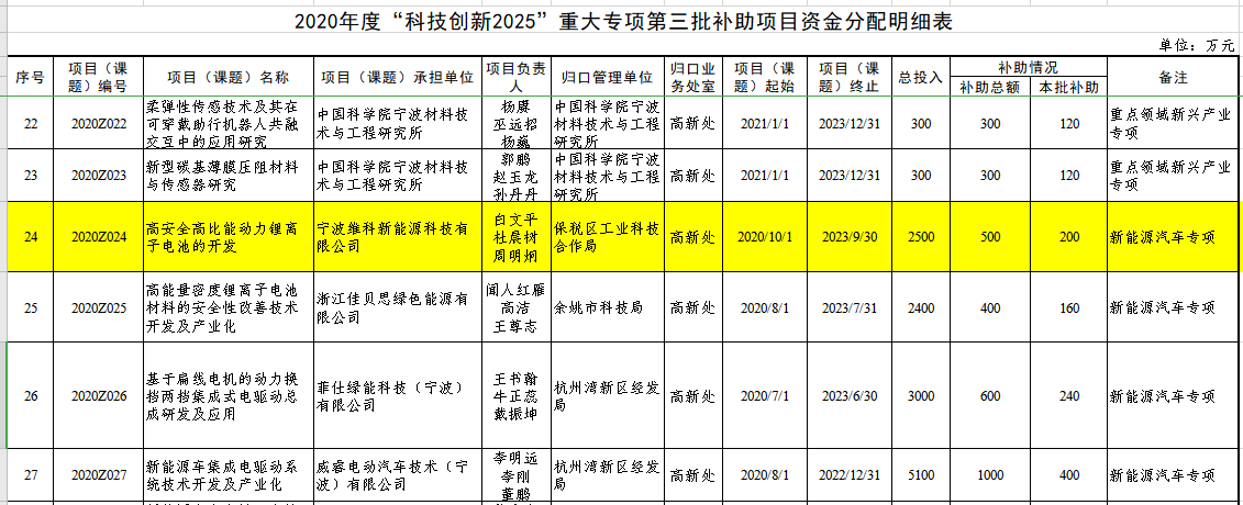 12月15日、寧波市財政局は「寧波市2020年科學(xué)技術(shù)発展特別基金(第3回バッチ補助金の主要特別プロジェクト)の発行に関する通知」(Ningbo Finance [2020] No.1214)を発行し、寧波VEKEN新エネルギーテクノロジー有限公司が宣言した「高安全?高比エネルギー動力リチウムイオン電池の開発」プロジェクトが採択された。 2020年に寧波市から「科學(xué)技術(shù)革新2025」大型特別プロジェクトの受注に成功し、第一期の補助金200萬元を獲得した。