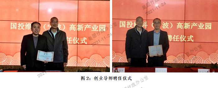 まず、國投維科(寧波)ハイテク産業(yè)園創(chuàng)業(yè)指導者の任命式が行われ、維科雲(yún)羿プロジェクト総経理の胡軍が2人の創(chuàng)業(yè)指導者に任命狀を授與した。