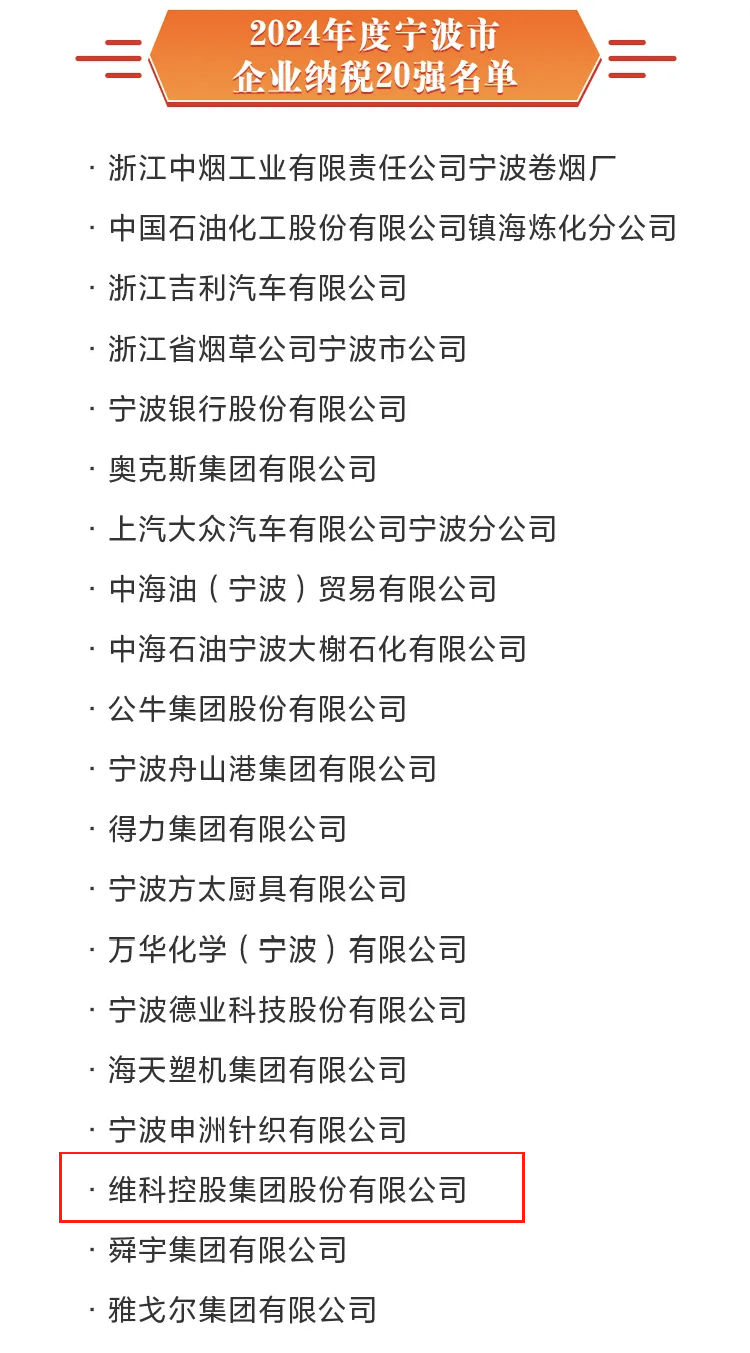 6月13日、2025年寧波市 「科學技術革新と産業(yè)革新の深い統(tǒng)合を促進し、民間経済の質(zhì)の高い発展を加速するための會議 」と 「2025寧波起業(yè)家精神とイノベーションリスト 」リスト発表活動が開催され、維科グループは、「2024寧波納稅トップ20企業(yè) 」賞を受賞した。「2024年寧波納稅トップ20企業(yè) 」を獲得した。