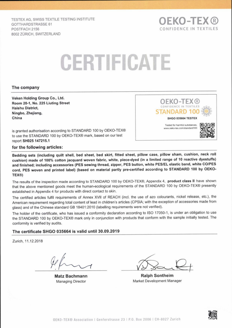 2018年12月11日、維科集団はTESTEXスイス紡績検定有限會(huì)社からSTANDARD 100 by OEKO-TEX認(rèn)証証明書を受け取り、証明書番號はSHGO 035664、証明書有効期間は1年である。