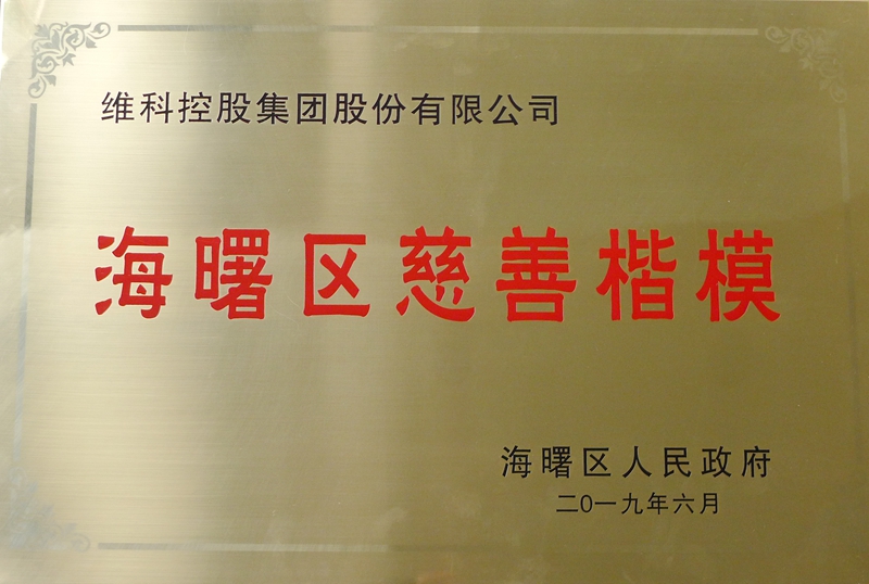 2019年6月11日午後、海曙區(qū)政府は2019年慈善活動(dòng)會(huì)議を開催した。団結(jié)互助、貧困扶助の慈善文化を大いに発揚(yáng)し、社會(huì)各界の公益に熱心で、貢獻(xiàn)に好む良好な気風(fēng)を唱道するため、會(huì)儀中海曙區(qū)人民政府は公益慈善分野で際立った貢獻(xiàn)をした企業(yè)?事業(yè)體、郷鎮(zhèn)、街道、コミュニティ及び個(gè)人を表彰し、維科持株グループ株式會(huì)社は「海曙區(qū)慈善模範(fàn)」の稱號(hào)を獲得した。